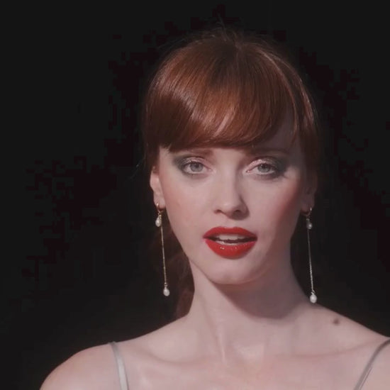 Our classic huggie earring is designed with gold chain and freshwater pearls. This more formal take on our threader style earrings brings a pop of light with two pearl accents as it frames both the face and the neck to elongate and accentuate your look.