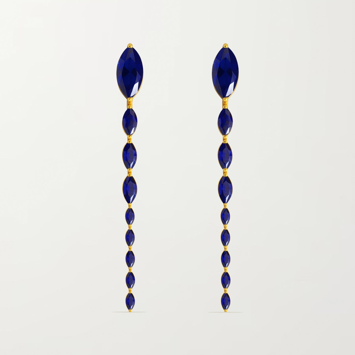 Marquise-shaped sapphire blue stones in descending size line up to create this sophisticated earring. Designed to frame the face while bringing out your most stunning features, these earrings are not only your best new accessory but the ones you’ll be showing off the most. Perfect for elegant affairs or special moments in need of a stunning accessory.