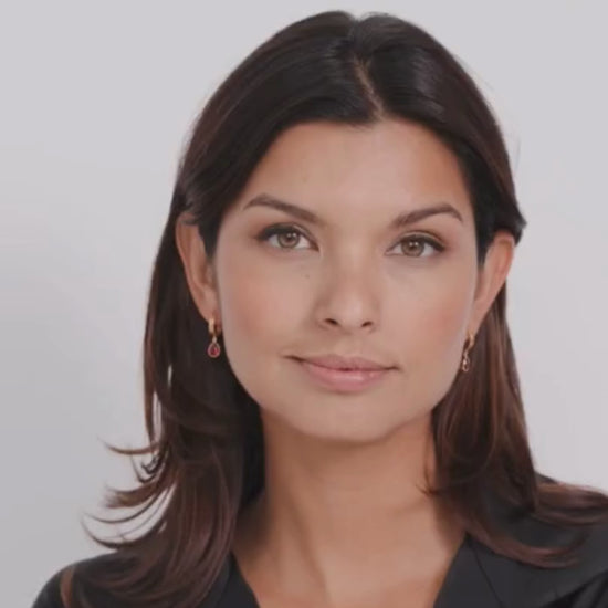 A gold hoop speckled in small rubies holds a larger pear shaped ruby to create the Sofia Earrings. This majestic piece is a perfect compliment to any date night look or dressy affair. A perfect compliment piece to our Three Tiered Floater Choker in Ruby.